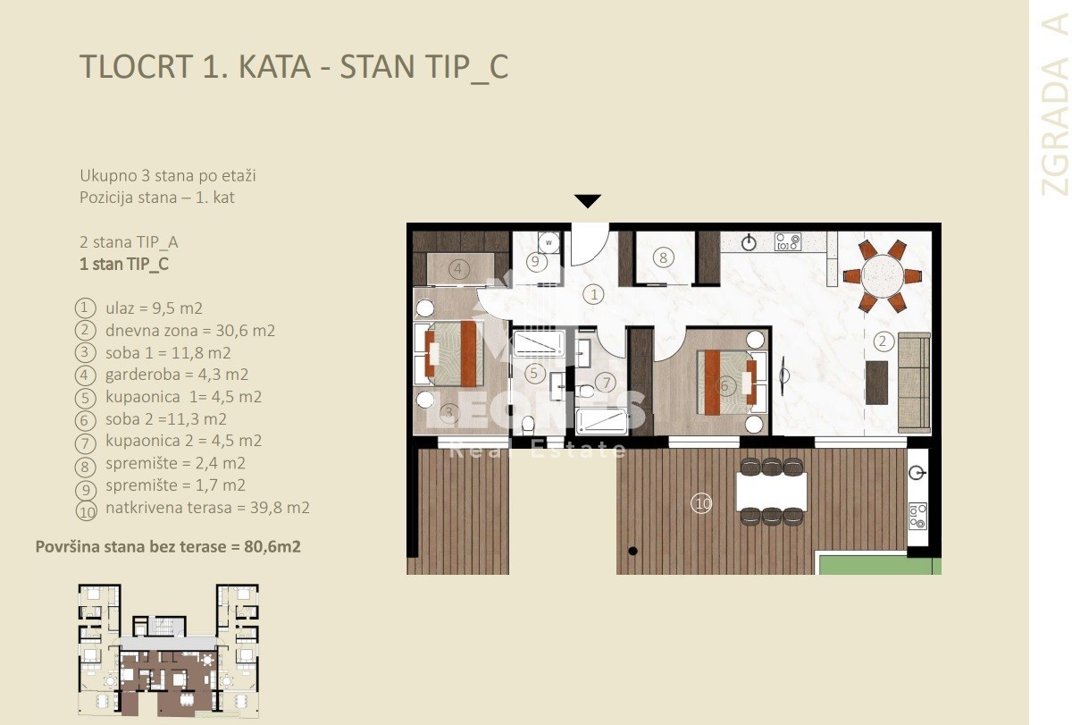 Ovaj predivan stan ima 115, 88 m2 od kojih je 80, 60 m2 stambeni dio ( ulazni hodnik, 2 spremišta, garderoba, 2 kupatila, 2 spavaće sobe, kuhinja s blagovaonicom i dnevni boravak. Stanu pripada natkrivena terasa od 39, 80 m2 s pogledom na more, spremište od 3, 90 m2 i parkirno mjesto od 12, 50 m2.